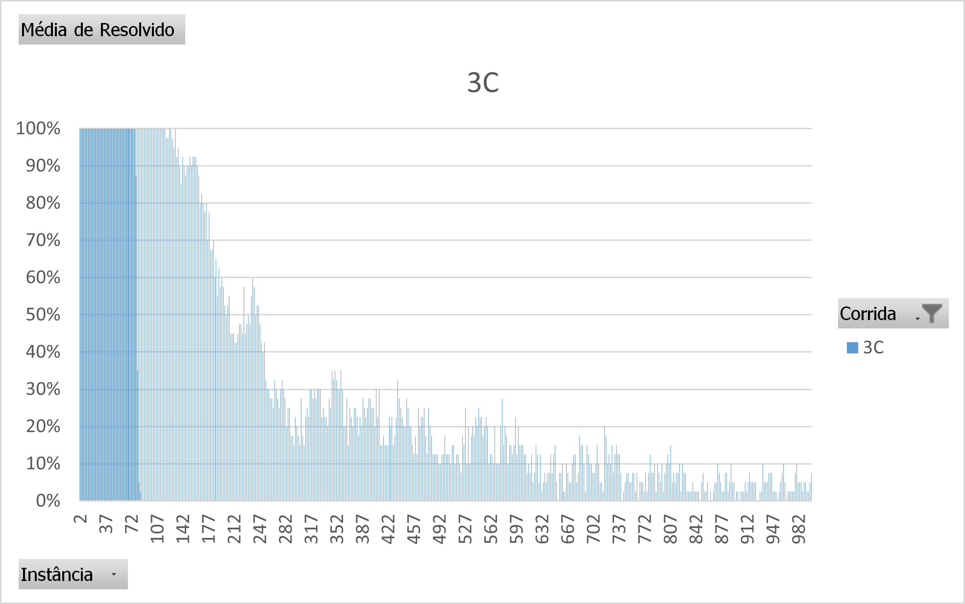 O último teste foi realizado com instâncias de 1 a 1000, pelo que apresentamos o resultado em gráfico, com as instâncias nas abcissas, e com a percentagem de instâncias resolvidas no eixo das ordenadas: